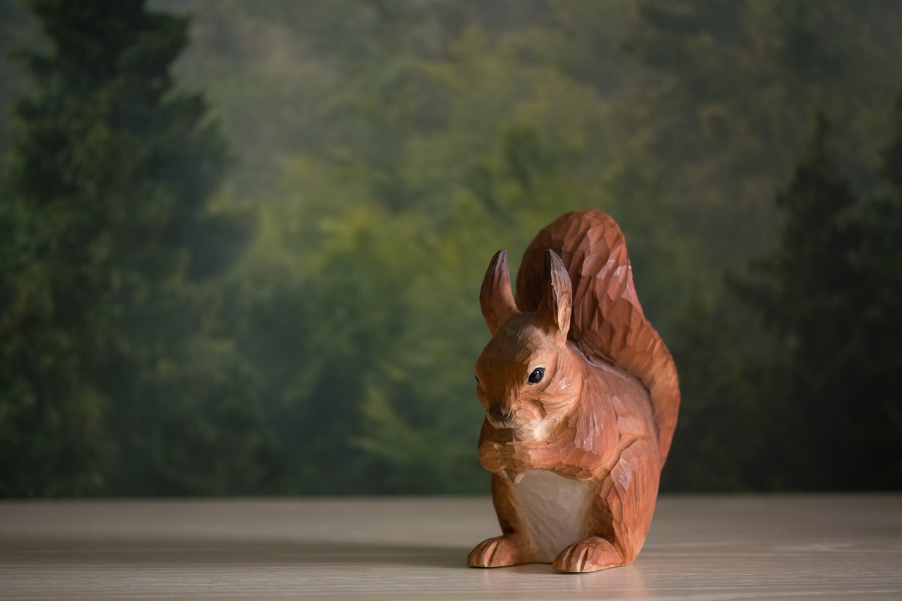 手作りで彫刻およびペイントされた、本物のような木製のリスです。
